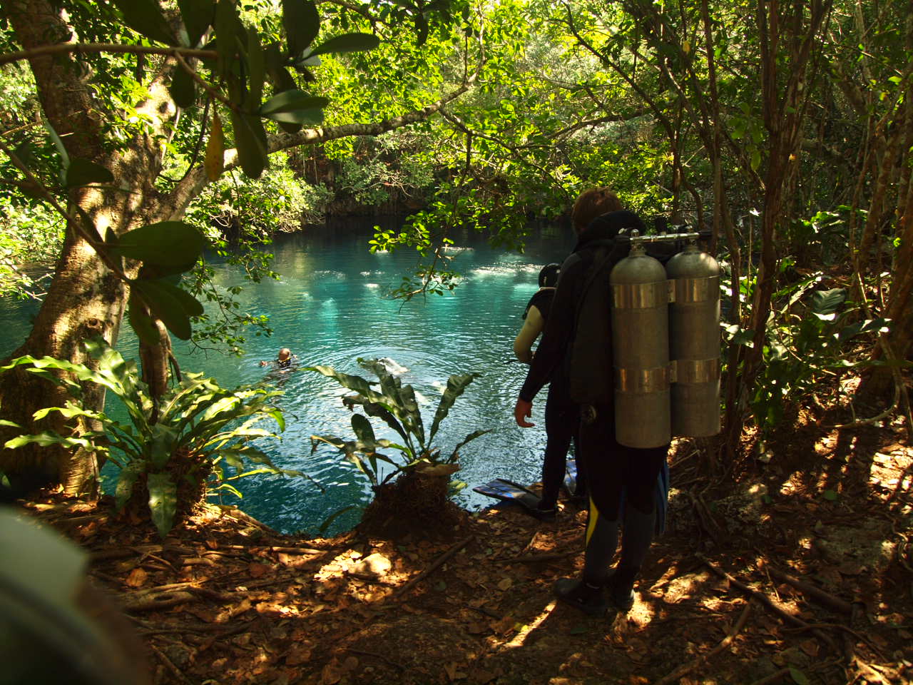 Part of the dive briefing included a walk to the dive site along a little trail cut through the jungle. During the walk the guide pointed out an oregano tree, gum tree, and lemon trees. The trail wound around to a flat rock that looked down over the sinkhole Angelita. After the site briefing we geared up to dive. We walked up to the same flat stone, held onto our fins, and did a 15 ft / 4.5 m giant stride down into the water, grouped up and started our descent.