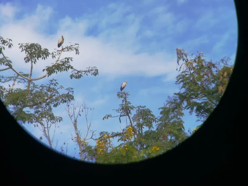 在云南版纳植物园透过望远镜看到的钳嘴鹳和蓝色天空