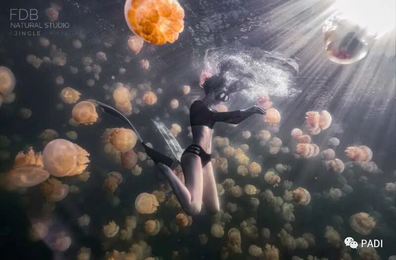 47@小小小敏:学会自由潜后的第一次出海选择了美丽的帕劳最难忘的就是被这片可爱的水母包围着怕脚蹼伤到它们了还马上把脚蹼脱了