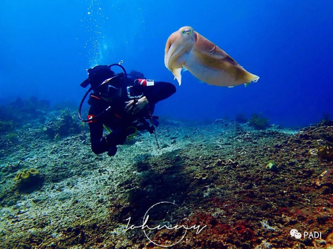 15@Jersey🦀:去年在印尼科莫多的siaba besar潜点,大蓝水能见度足有30米~远远看到一只大胖乌贼眯着“贼眼”悬停在一块珊瑚礁上悠然自得,潜伴凑上前去仰拍它扬起的两只触手,我顺势成功抢镜~
