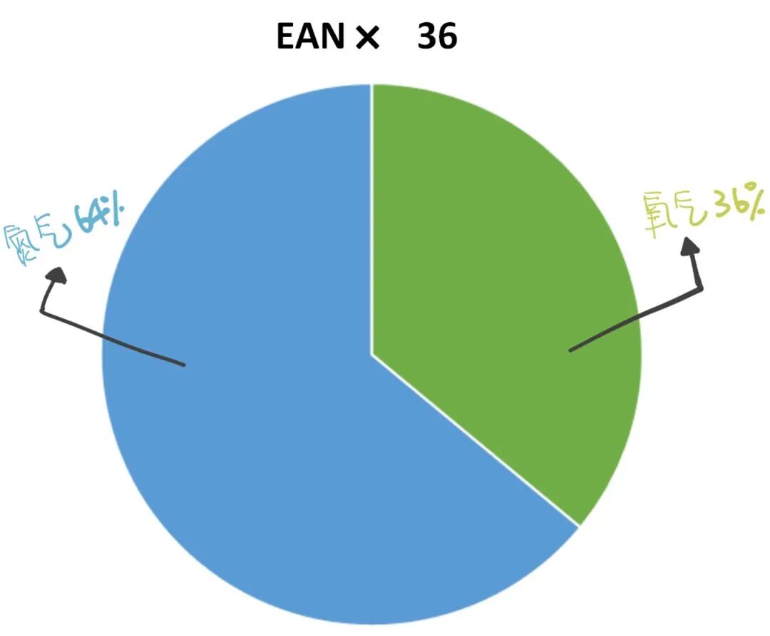 一般空气约由79%的氮气和21%的氧气组成(此处不计算含量低气体),而高氧空气,顾名思义,就是氧气含超过21%的氮气氧气混合气体。潜水员通常用「EAN」表示高氧空气(Enriched Air Nitrox),通常会在「EAN✖」后面加上氧气含量的比例数字。例如,「EAN✖36」就表示含有36%氧气的高氧气瓶。