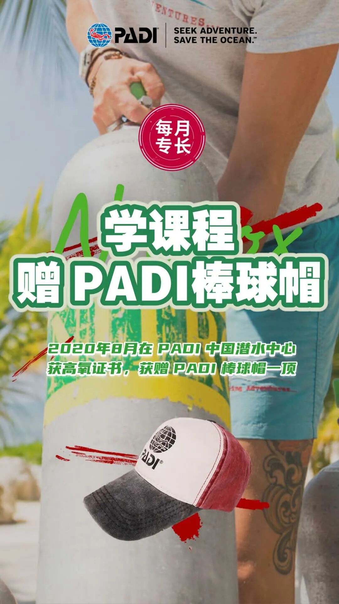 8月1日-31日,在 PADI 中国潜水中心报名学习并获得高氧专长证书,还可获赠 PADI 官方周边棒球帽一顶哦!