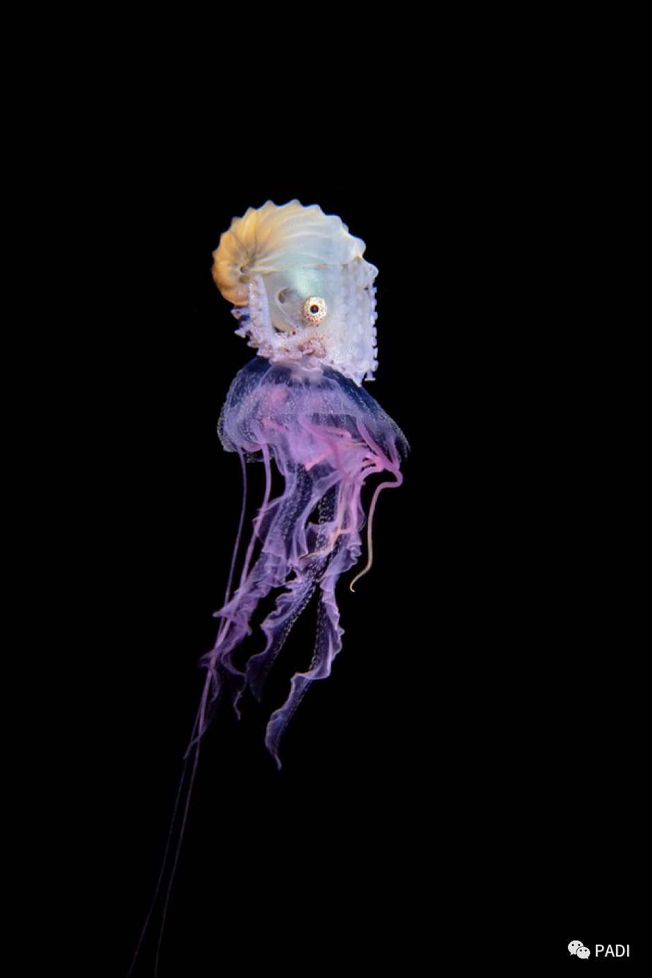 张竞功图中是一只骑在水母上的雌性船蛸。船蛸,又名纸鹦鹉螺。实际上它并不是螺类,而是头足纲类,简单来说雌性船蛸是一种带有壳的章鱼,因其壳薄如纸,故俗称“纸鹦鹉螺”。无论雄性亦或雌性船蛸均有附着在水母亦或其他水中漂浮物上的习性,这一习性原因目前还不得而知,普遍说法是搭便车或是躲避天敌。