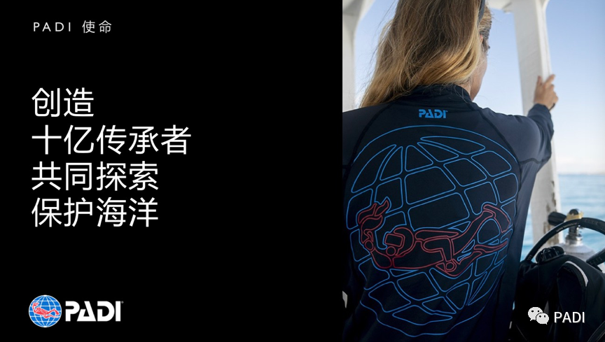 作为全球最大的潜水培训组织,PADI 是海洋环保的代言人,以“于人类和海洋间创造平衡”为愿景;以“创造十亿火炬手”为使命;致力于保护海洋,推广海洋文化,共同探索奇遇,与大家共同携手守护蔚蓝。