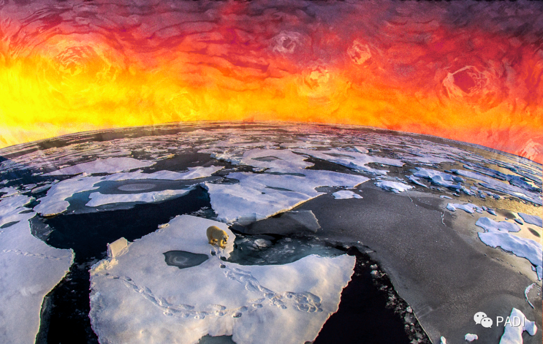北极熊站在融化的海冰上,摄影师受到梵高星空的启发,创作了这幅作品。展现了由于冰川融化,浮冰逐渐缩小,破碎狭小的冰块漂浮在海面上。苍茫的海上竟没有能让北极熊休憩的地方,引人深思。