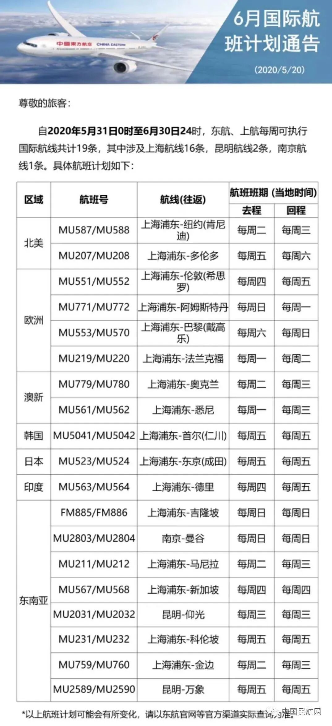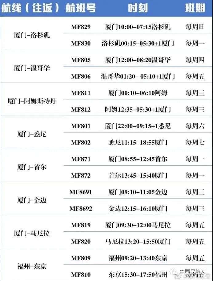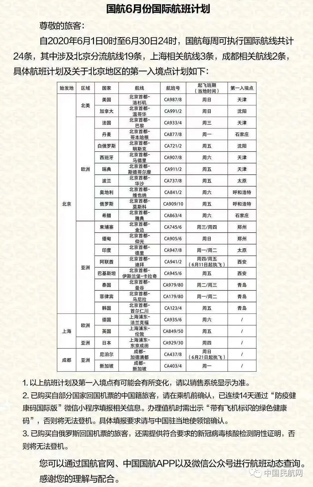 据中国民航网发布,国内几家航空公司陆续公布了6月最新的国际航班计划,如下: