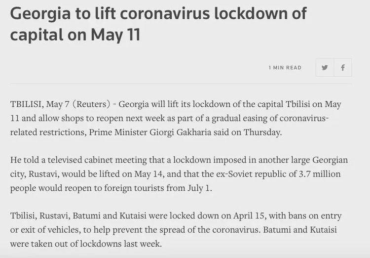 格鲁吉亚:格鲁吉亚总理在5月7日的讲话中提到,该国将自6月15日起恢复境内旅游,自7月1日起重新对外国游客开放格鲁吉亚是全球第一个正式宣布将恢复旅游业的国家。