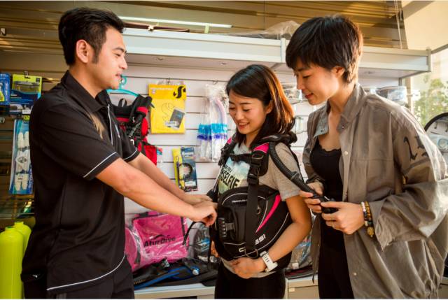 每一间 PADI 潜水中心都有专业人士可以为你提供购买水肺潜水装备的导购建议:各种装备的优点、缺点和帮助你挑选最适合你的潜水装备。