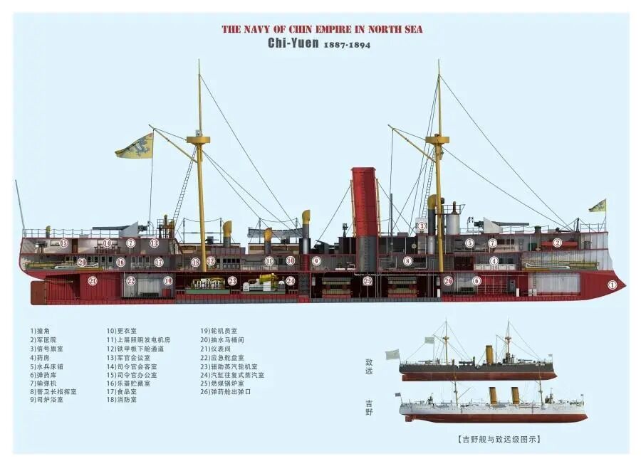 初期的舰队主力军舰有25艘,辅助军舰50艘,“定远”、“镇远”两艘战列舰更被誉为“亚洲第一舰”,其规模一度成为“东亚第一”、“世界第九”。虽然不是大型铁甲舰,但作为“快船”的我有着铁甲舰无法比拟的高航速。