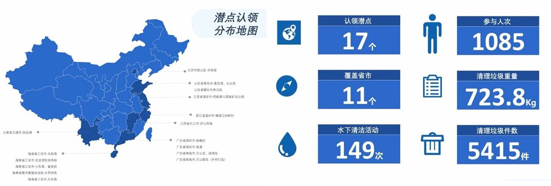PADI 中国在2019年,联合无境深蓝和资助各城市潜水中心,进行海洋清洁活动。作为能够和海洋亲密接触的潜水员,我们也在行动着,2019年, PADI 联合无境深蓝开办了认领一个潜点、打击海洋垃圾数据挑战赛等多种形式的清洁活动,活动得到全球潜水员、环保人士的积极响应。