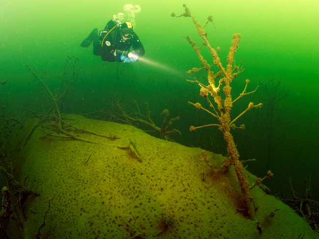 Diving in the White Sea is an immersion into an absolutely different underwater world. The water is extremely transparent and is rich in specific White Sea fauna that belongs to a boreal type. The surface of rocks is covered with soft corals, actiniae, sponges, ascidians, and hydroids. Starfishes, brittle stars, crabs and shrimps wriggle along in cracks of rocks and between the stones. Such fish species as a sea perch, a catfish and a flounder can be met here. You can see graceful nudibranches, crayfish eremites, large volute carnivorous mollusks of the White Sea – Neptunea and Bukcinum, and the rarest brittle star with an exotic name – Gorgona’s (Gorgonocephalus) Head.