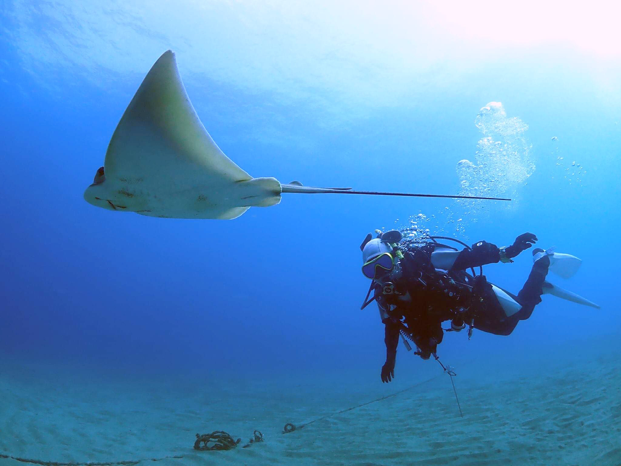 ビーチとボートのどちらも楽しめる、西伊豆屈指の人気エリア。「黄金崎公園ビーチ」は美しい芝生の公園に面した景観豊かなビーチダイビングポイントで、海底の白い砂地はマクロ生物の宝庫。ウミウシや甲殻類など珍しい生物が数多く観察できます。海況は年間を通じて安定しており、初心者の講習にも最適です。ボートポイントも充実しており、港から約5〜8分で到着。初夏にはトビエイの群れが見どころで、マンボウやウミガメ、ハンマーヘッドシャークなどの大物が目撃されたことも。秋には壁のような魚の群れが圧巻。施設も充実しており、リゾート気分で快適にダイビングを楽しむことができます。