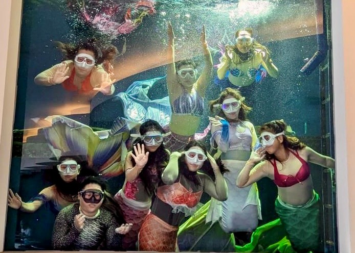 美しい尾ひれをつけて水の中で自在に泳ぐのはマーメイドの醍醐味です。みなさん手をふってくださっているのを水槽からみるとなんともいえない高揚感が生まれます。その瞬間マーメイドになってよかったと思います。