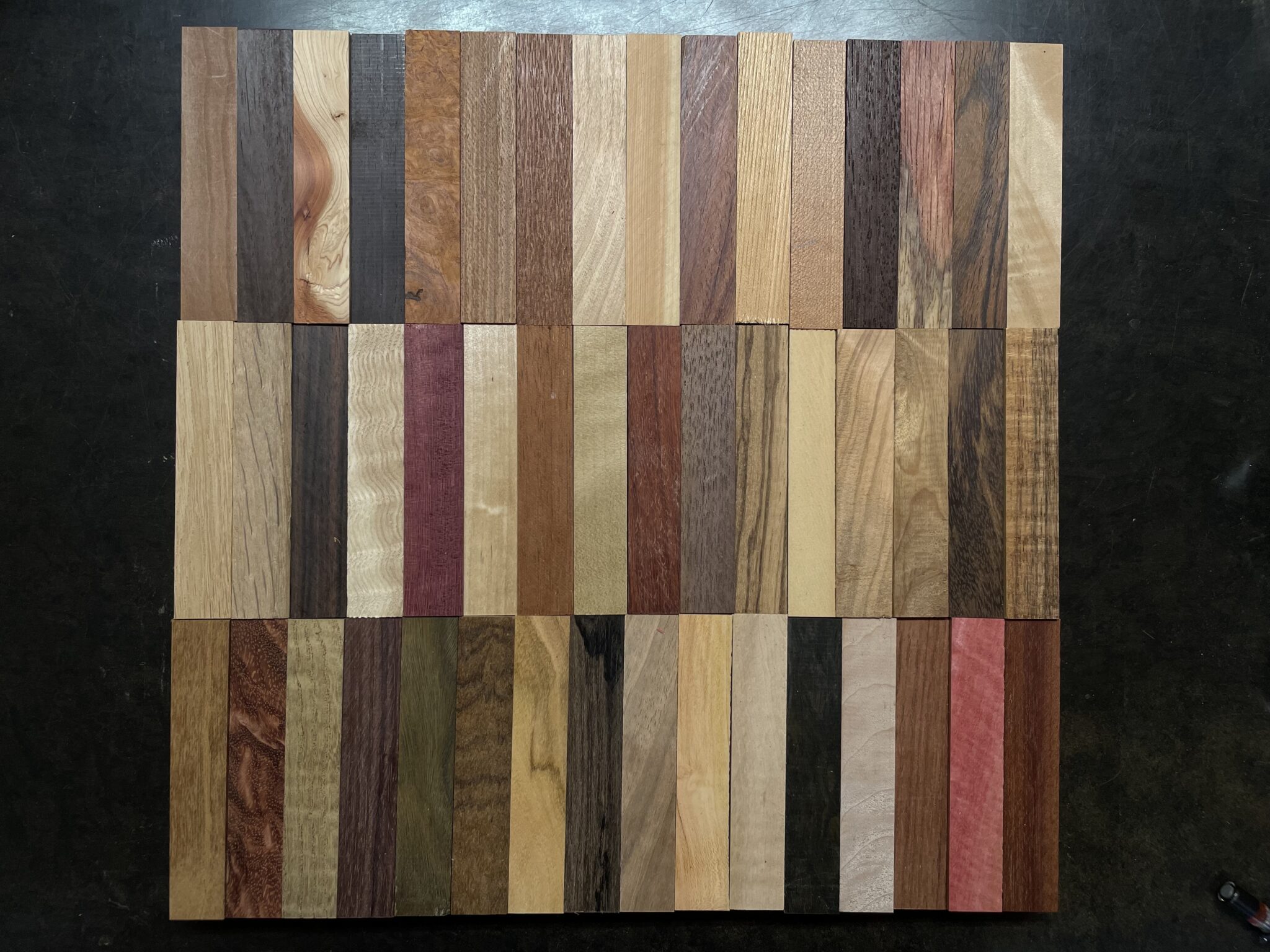 木って、本当に面白いんです。世界には大人ですら知らないような特徴を持った木材がたくさんあります。紫色の木、オレンジ、黄色、真っ赤、ピンク、緑、真っ黒、真っ白……バリエーションが豊富で、香りも違うし、重さも違う。水に沈むほど重たい木もある。粉に触れるとかぶれる木もあって。ここにさらに、杢(もく)と呼ばれる通常の木目とは異なる特徴的な模様が個体によっては現れます。「こんな木、見たことない!」って、実際に工房に来ていただいたお客さんはその多彩さに必ず驚かれています。