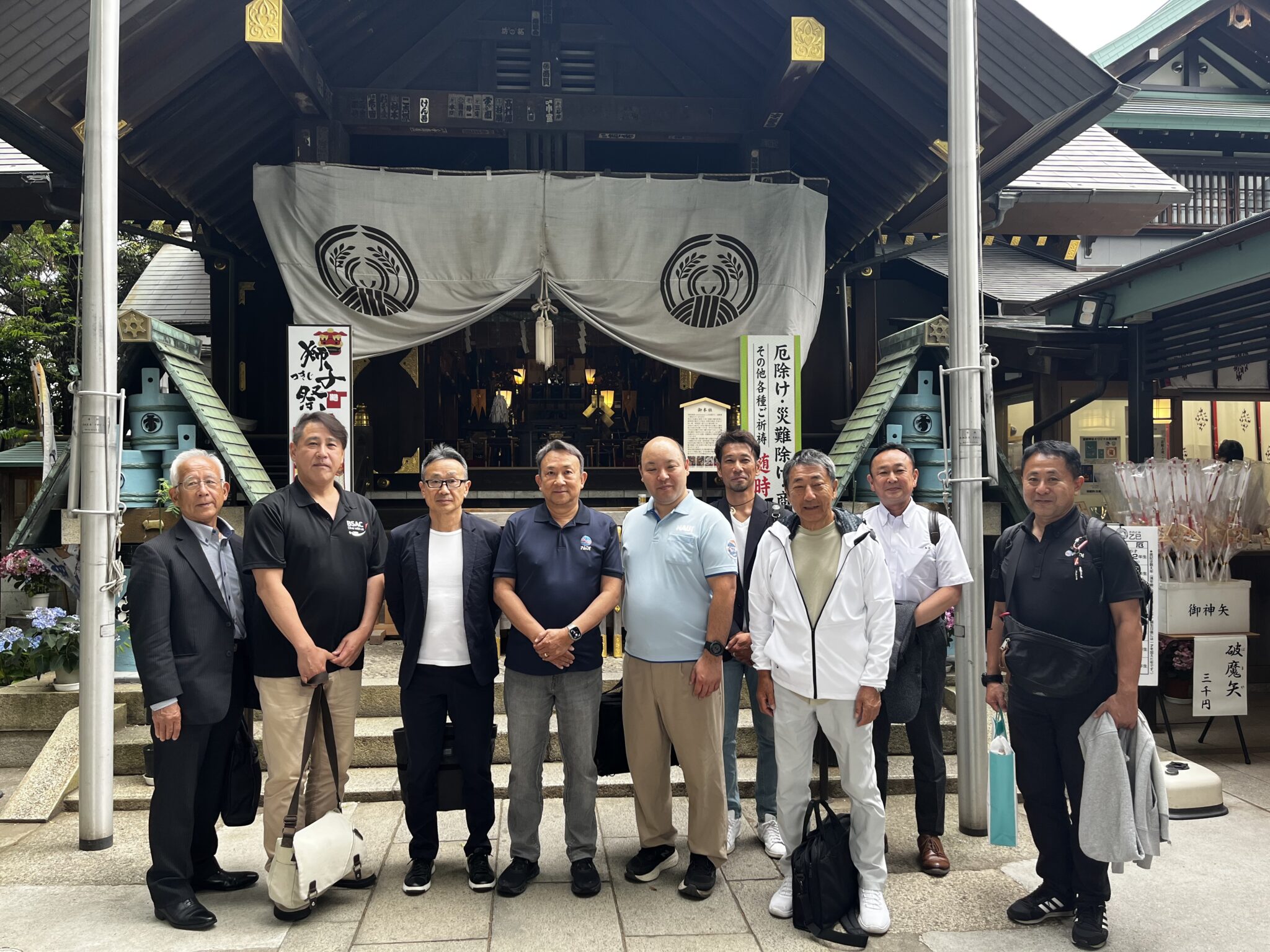 2025年は5月24日が土曜日にあたるため、記念日を前にした5月23日(金)、PADIを含むCカード協議会加盟団体の代表者たちが、東京・築地の波除神社にて参拝を実施しました。