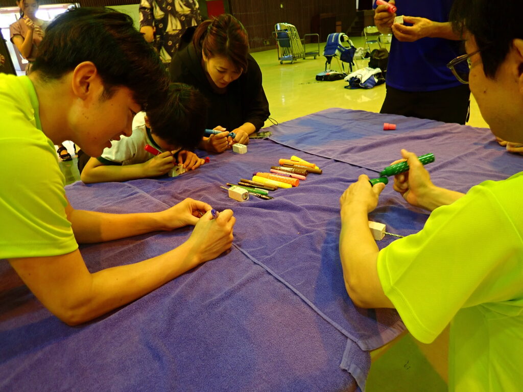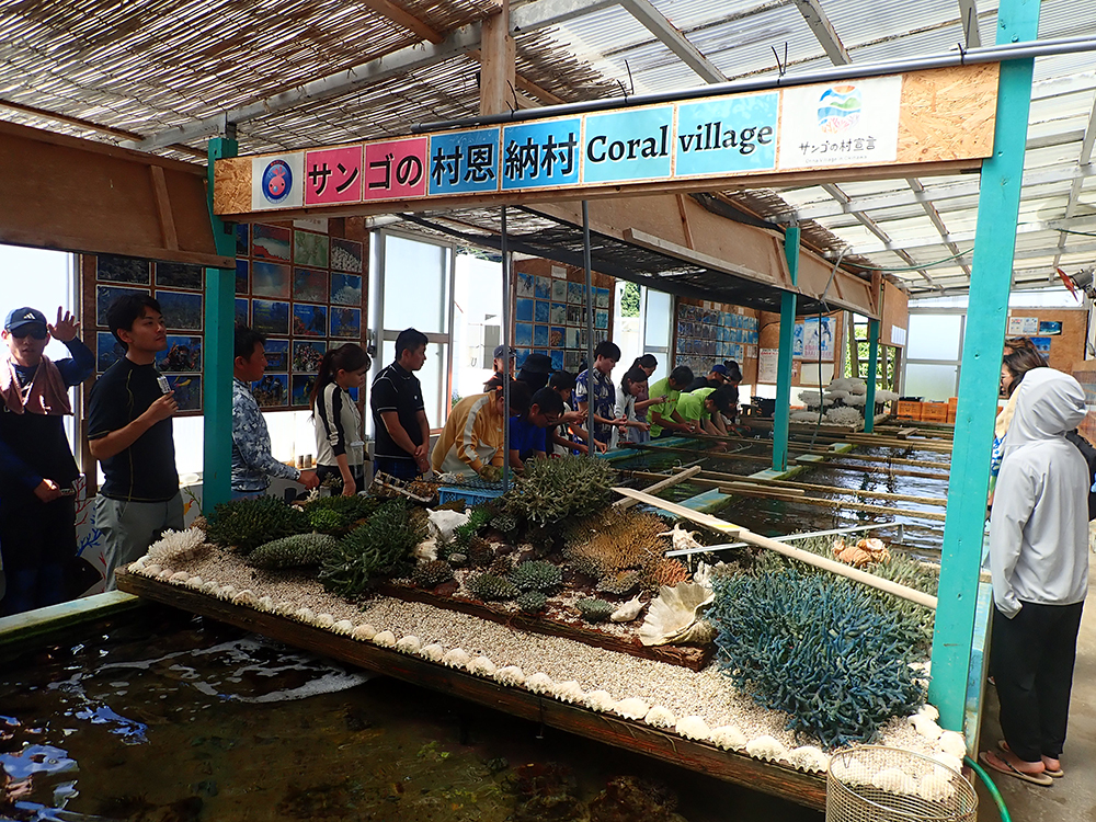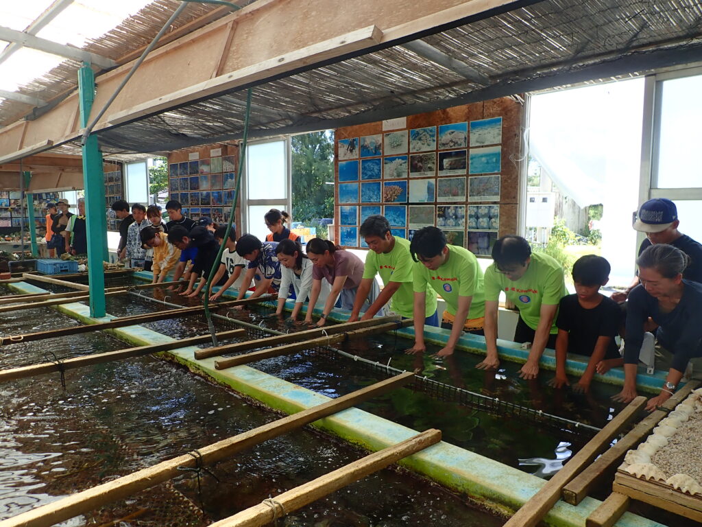 一方、ノンダイバー・プログラムでは、参加者がそれぞれサンゴや海への想いをメッセージスティックに記し、恩納村漁協のサンゴ養殖場「サンゴハウス」を見学。そこで20本のサンゴ苗づくりを体験しました。サンゴは熱に弱いため、作業の前には手を海水で冷やすなど、細心の注意を払っての作業です。