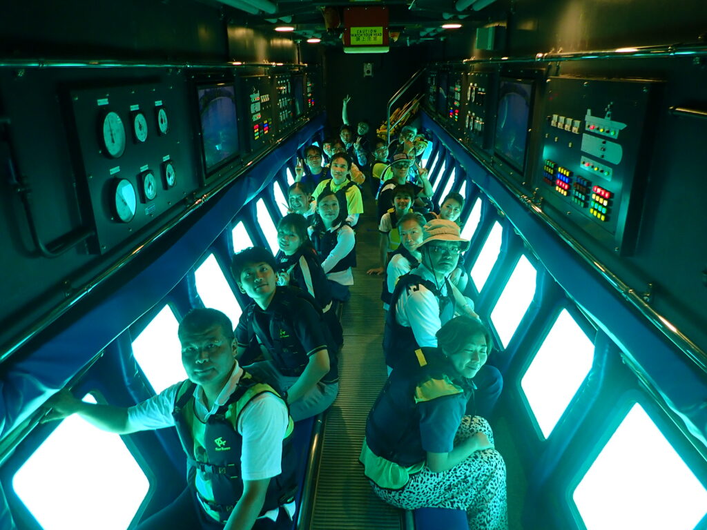 作業後は、ANAインターコンチネンタル万座ビーチリゾート所有の半潜水艇「サブマリンJr.II」へ乗船。全長13メートル超の“動く水族館”からは、チーム美らサンゴによって植え付けられたサンゴや恩納村の美しい水中世界を観察しました。