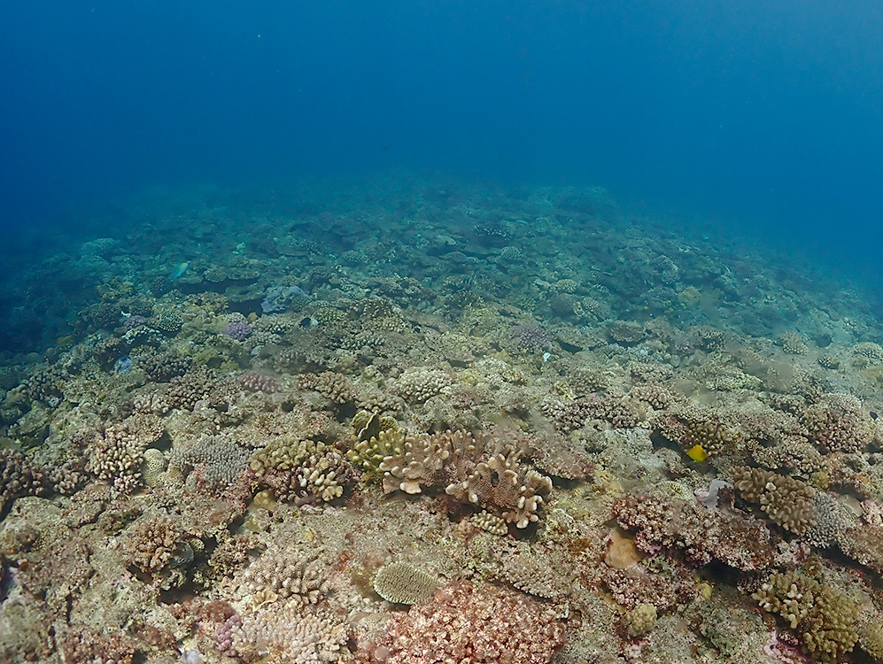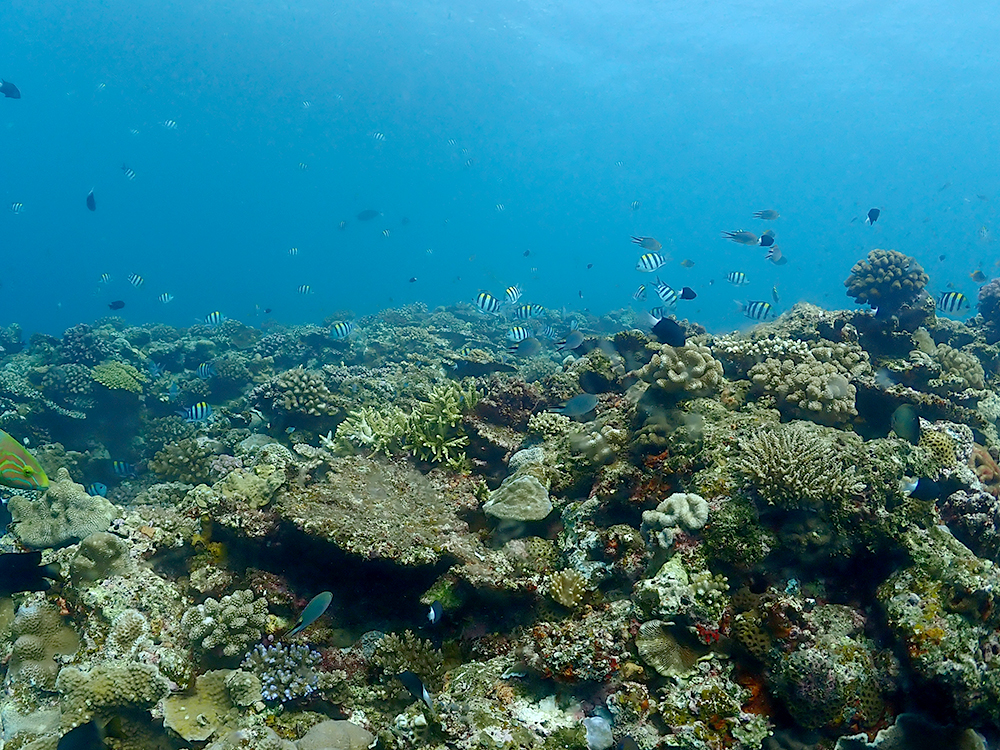 その名の通り、海底には生命力あふれるサンゴが群生し、浅瀬ではハードコーラルがまるで花畑のように広がっています。ダイナミックな地形も魅力で、ドロップオフは水深30mへと一気に落ち込み、25m地点のオーバーハングにはホワイトチップ(ネムリブカ)や大型のハタが悠然と棲みついています。
