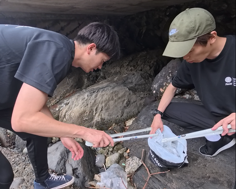 そして、今回のイベントの中心となったのは、ダイビング後のビーチクリーン活動。器材を片付けたあと、参加者はトングやごみ袋を手に漁港周辺を歩き、漂着したプラスチックごみなどを丁寧に回収しました。特に漁港内の一角には、風や波に運ばれてたどり着いたごみが溜まりやすく、そこでは多くのダイバーが協力して清掃に取り組む姿が見られました。